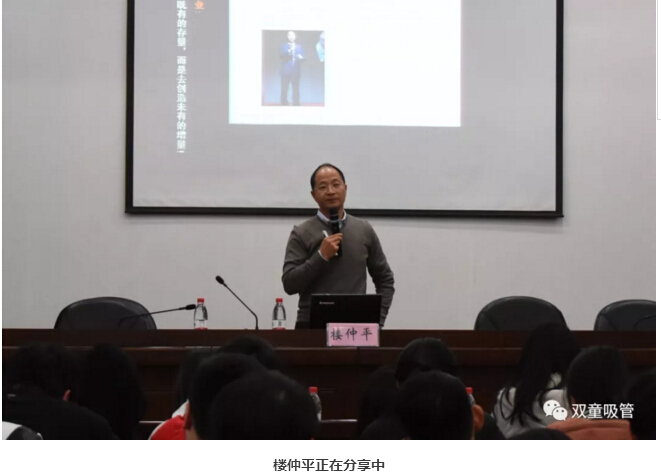 “雙童”樓仲平圍繞“堅持觀、創(chuàng)新觀、責任觀”三個關鍵詞分享了他的創(chuàng)業(yè)觀。其中,最精彩的莫過于在分享的下半場樓仲平帶領學生們認知商業(yè)的本質(zhì),思考作為創(chuàng)業(yè)者要用什么樣的態(tài)度去創(chuàng)業(yè)!