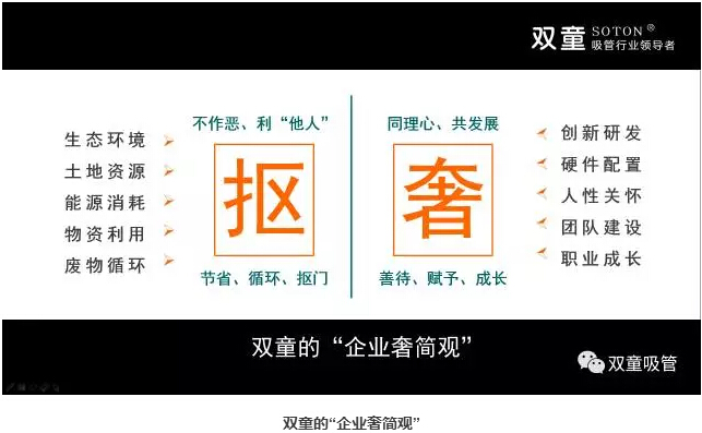 在商業(yè)本質(zhì)的認知下,“雙童”形成了自己獨特的企業(yè)“奢簡觀”:公司在建廠之初建設了雨水收集、廢水處理、垃圾回收等節(jié)能降耗設施,通過這樣創(chuàng)新的方式把生產(chǎn)做到了零排放。與此同時,建設花園式工廠,提高土地利用率,對能源、物資追求產(chǎn)出最大化,對廢物不斷循環(huán)利用,從而每年“摳”出數(shù)百萬元,“奢侈”地用在創(chuàng)新研發(fā)、硬件配置以及對員工的人性關懷、團隊建設上,和團隊一起共發(fā)展!