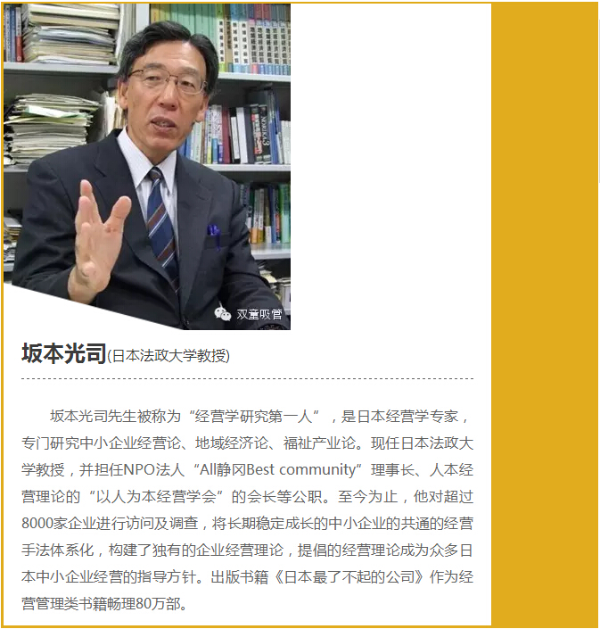 早在2016年,坂本光司老師就曾帶隊來到“雙童”實地參觀,并和“雙童”樓仲平進行了深度交流,高度認(rèn)可了“雙童”的人本經(jīng)營模式。在此后,不斷有日本企業(yè)主團隊來“雙童”調(diào)研學(xué)習(xí),樓仲平也數(shù)次受邀前往日本各所大學(xué)授課,分享“雙童”的利他經(jīng)營理念和企業(yè)文化,引發(fā)了日本企業(yè)界的強烈關(guān)注!