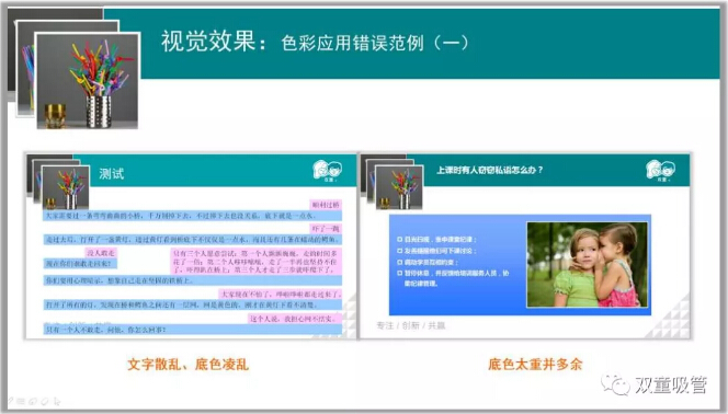 想要制作一個(gè)美觀的PPT,色彩的搭配也尤其重要!樓仲平也分享了色彩搭配的相近原則、色彩點(diǎn)綴的相對原則等技巧,下面就通過圖片來看看色彩的搭配和一些錯(cuò)誤的案例吧!