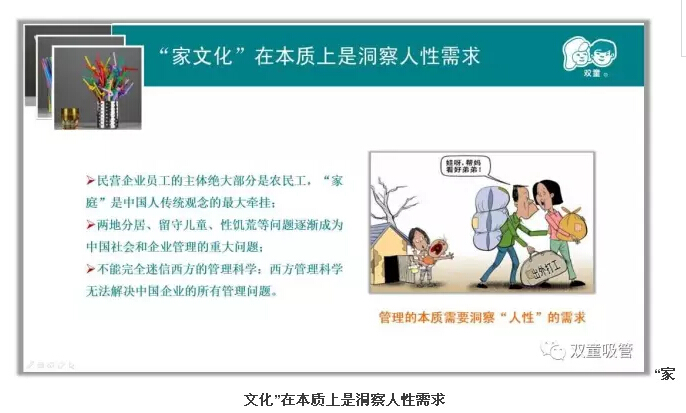 通過(guò)上述事件,“雙童”逐漸認(rèn)知到:“家”是員工最大的牽掛,只有內(nèi)心沒(méi)有太多牽掛,情緒沒(méi)有太大波動(dòng)的員工,才能生產(chǎn)出優(yōu)質(zhì)產(chǎn)品!正所謂“人心”最難管,員工沒(méi)有了后顧之憂,才能全身心投入到工作當(dāng)中,才能做出更加完美精細(xì)的產(chǎn)品!因此,從2005年9月開始,“雙童”明確把“家文化”作為員工管理的著力點(diǎn),以“小家”形成“大家”,凝聚團(tuán)隊(duì)“人心”!