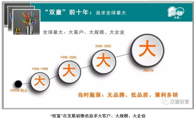 因此,“雙童”在最初的10年,正是沿著這樣的思路,以量取勝,不斷擴大規(guī)模,以規(guī)模換效益,追求大客戶,喜歡大訂單,成為了吸管行業(yè)的巨頭。樓仲平坦言:當時的大客戶往往一個單子就是幾十個貨柜,接下來后公司 3-5個月需要專注做它的單子,無暇應接別的中小客戶,不用滿世界去找訂單做。