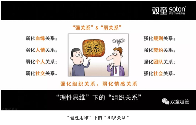 正是受到西方“理性思維”的影響和推動(dòng),“雙童”創(chuàng)立了一套組織關(guān)系哲學(xué),用來(lái)弱化血緣關(guān)系,強(qiáng)化規(guī)則關(guān)系;弱化人情關(guān)系,強(qiáng)化契約關(guān)系……從而突破“道德”認(rèn)知、回歸“理性”本源!