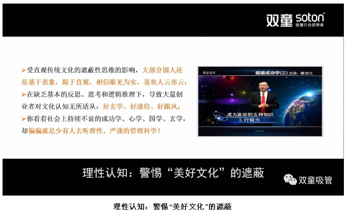 用中國(guó)人的感性思維來(lái)解決在生活中、家庭中的人際關(guān)系,用西方“理性思維”的邏輯推理來(lái)解決企業(yè)經(jīng)營(yíng)過(guò)程中的方方面面,從而達(dá)到中西方兩種思想的融合!大體上保持“理性”(管理經(jīng)營(yíng)上),理性中帶點(diǎn)“感性”(人際關(guān)系上),偶爾來(lái)點(diǎn)“非理性”(創(chuàng)新求變上),用“儒家中庸”與“邏輯變革”融會(huì)貫通、為我所用!