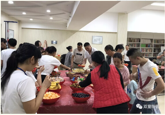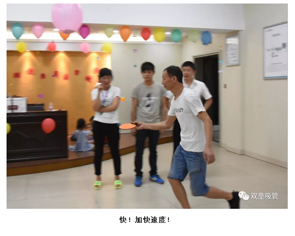 “比比誰更快?”可是團隊游戲哦,考驗的是大家的默契程度!瞧,第一位出戰(zhàn)者剛運送完乒乓球,第二位就開始吃西瓜、第三位馬上用眼鏡吸管喝飲料啦…… 最快的團隊僅僅用了兩分鐘就完成了游戲,大家真是默契十足呀!