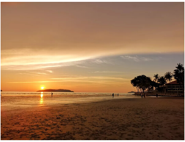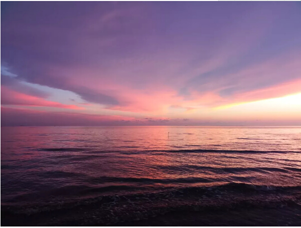 到了太陽快下山時,我們也回到了沙灘上。只見一輪紅日慢慢向山那邊落下去,云彩也被映襯得金黃金黃的,倒映在水中的光也讓人頭暈?zāi)垦#牪婚_眼。沒幾分鐘,太陽就下山了。就當(dāng)我們覺得“世界上最美的落日”也就是不過如此時,神奇的事發(fā)生了!太陽下山以后,刺眼的光芒也不見了,而留下來的云朵開始了他們的表演,演變成了黃色、藍(lán)色、紫色,不斷變幻,像是打翻了顏料盤后幾種顏色混到了一起。瑰麗的云層壓得很低,似乎和大海連到了一起,海天一色。此情此景,讓每個人的心都變得柔軟起來。此時此刻,無語也溫暖,平凡也浪漫。