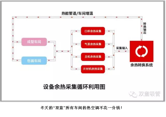 設(shè)備余熱水采集和設(shè)備余熱采集循環(huán)系統(tǒng):“雙童”對所有經(jīng)過模具的50度溫水進(jìn)行收集,處理之后供應(yīng)到所有寢室衛(wèi)生間給員工洗澡洗衣生活之用。同時,“雙童”也引進(jìn)日本技術(shù)對所有生產(chǎn)設(shè)備的余熱和廢氣進(jìn)行采集并回收,再通過空調(diào)管道輸送到需要加溫的各個車間和工段。通過上述方式,“雙童”光是在余熱水采集和設(shè)備余熱采集方面,每年就節(jié)省了150多萬元,消滅了企業(yè)產(chǎn)生的污染和排放!