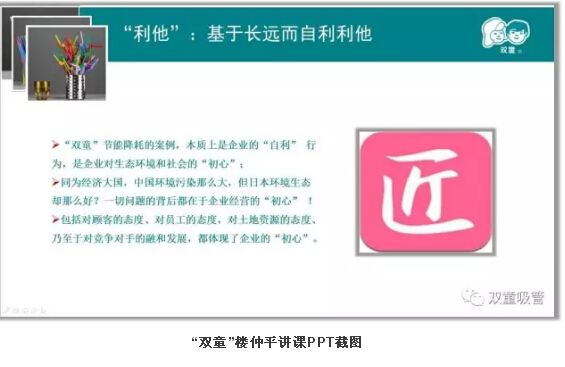 很多來“雙童”參觀的客人們,都會驚嘆于我們這座零排放無污染的生態(tài)節(jié)能工廠,并不斷追問:“到底是哪家建筑設(shè)計公司給你們設(shè)計的廠房?”每當(dāng)此時,吸管妞都會自豪地回答:“其實都是我們當(dāng)家人樓總自己設(shè)計的廠房!”那么,早在十多年前,整個社會環(huán)境都沒有倡導(dǎo)節(jié)能環(huán)保理念的當(dāng)時,“雙童”樓仲平為何會選擇帶領(lǐng)企業(yè)走這條發(fā)展道路呢?這背后也有一個精彩的故事。下面,吸管妞就借“雙童”樓仲平在浙江大學(xué)授課時的一段視頻,揭秘其中的奧秘!