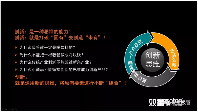 在傳統(tǒng)的認(rèn)知當(dāng)中,類似于吸管這樣的產(chǎn)品是典型的“低、小、散、弱”傳統(tǒng)邊緣產(chǎn)品。但“雙童”用創(chuàng)新的思維不斷努力,將一根小吸管做出各種花樣,顛覆了吸管就是喝飲料的傳統(tǒng)認(rèn)知!樓仲平也引導(dǎo)經(jīng)營戶們創(chuàng)業(yè)就是打破“固有”創(chuàng)造“未有”,用創(chuàng)新的思維去做產(chǎn)品、做事業(yè),用科學(xué)的發(fā)展觀去思考,一定能改變自己乃至于整個(gè)企業(yè)的命運(yùn)!
