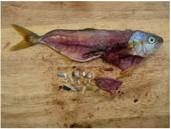 ▲在魚的體內(nèi),發(fā)現(xiàn)了許多塑料碎片,這種大小的碎片一般不會(huì)被人吃進(jìn)肚子