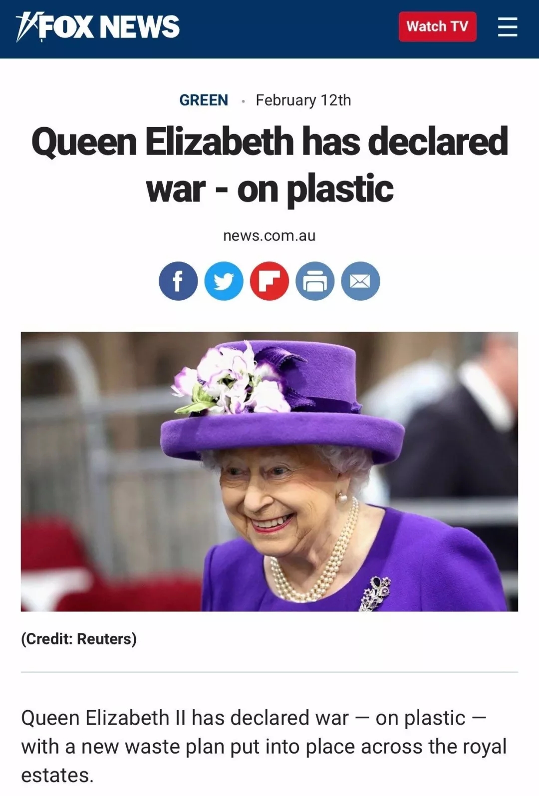 英國女王首先帶頭環(huán)保: