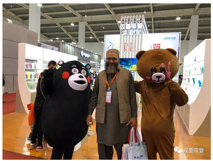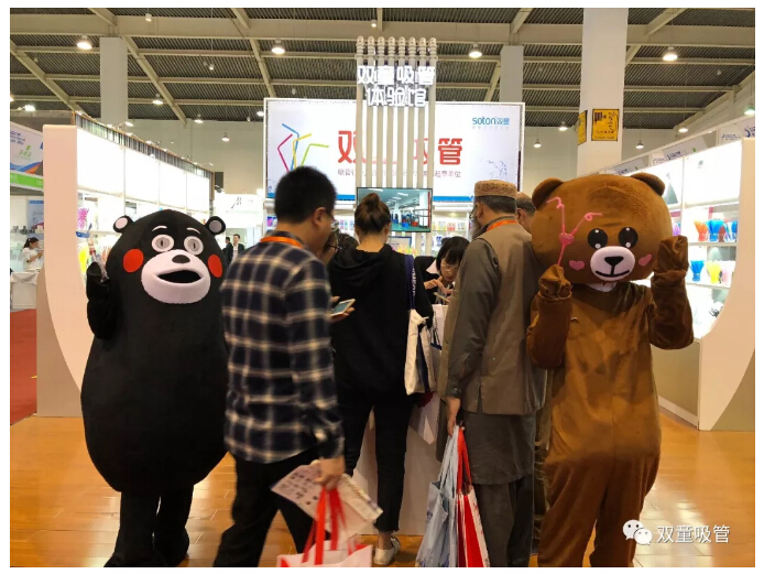 除了“可降解吸管”之外,“雙童”展區(qū)還出現(xiàn)了“網(wǎng)紅”哦!原來,是吸管妹妹們化身為抖音網(wǎng)紅熊和客商們進行親密互動,引來客商們的爭先合影!