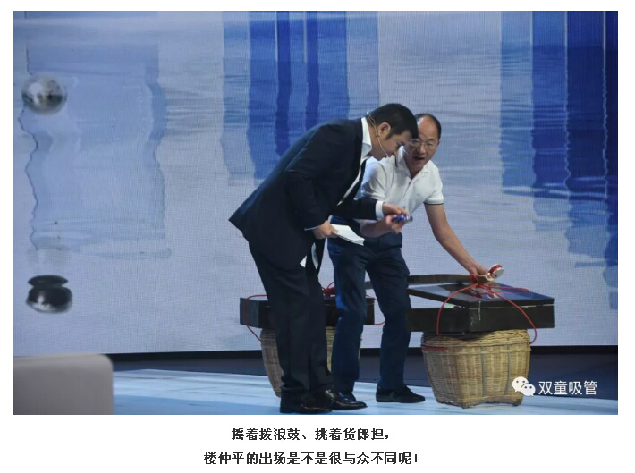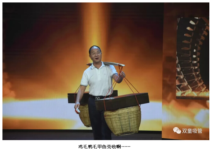 相比于其他兩位嘉賓,“雙童”樓仲平的出場方式可算是最“與眾不同”啦!看,當(dāng)主持人“鷗哥”邀請樓仲平出場時,他竟然搖著撥浪鼓、挑著貨郎擔(dān),口里還喊著“雞毛鴨毛甲魚殼收啊……”就上場了!