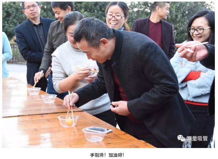 熱身活動過后,迎來了“夾乒乓球”大賽。每個小組的隊員依次夾起乒乓球放入下一個人碗中,直到所有球都傳到最后一個人手中,率先完成的小組獲勝!