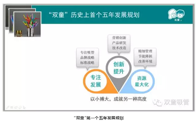 2005年,“雙童”提出了第一個(gè)五年發(fā)展規(guī)劃,其中提到了三個(gè)關(guān)鍵詞“專(zhuān)注發(fā)展”、“創(chuàng)新提升”、“資源最大化”,在這期間,“雙童”始終堅(jiān)持“以小博大”的理念,沒(méi)有貪大求全,急功近利,專(zhuān)注做好一根吸管!