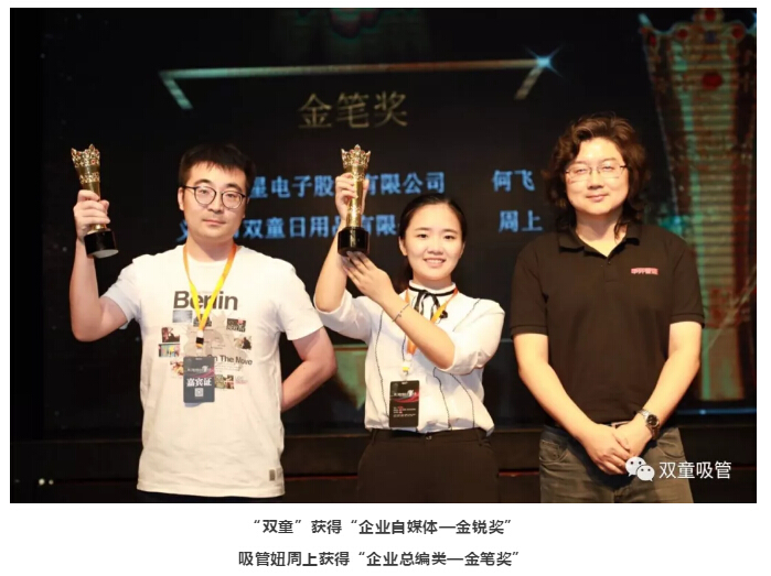 在大會現場,舉行了“第二屆中國優(yōu)秀企業(yè)自媒體”評選頒獎活動,雙童”榮獲了“企業(yè)新媒體—金銳獎”,吸管妞也獲得了壓軸獎項“企業(yè)總編類—金筆獎”!“這也證明了“雙童”的自媒體工作獲得了大眾及業(yè)界的認可!