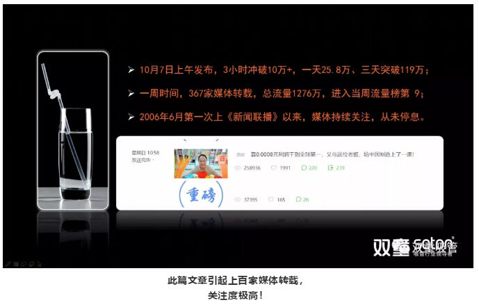 10月,“正和島”微信平臺報道“雙童”的一篇《靠0.0008元利潤干到全球第一,義烏這位老板,給中國制造上了一課!》文章一上線,在僅僅3小時的時間里便創(chuàng)造了10萬+閱讀的好成績,僅一周時間,引起上百家媒體轉載,總流量達到1276萬,進入當周微信流量排行榜,引起社會極大關注!