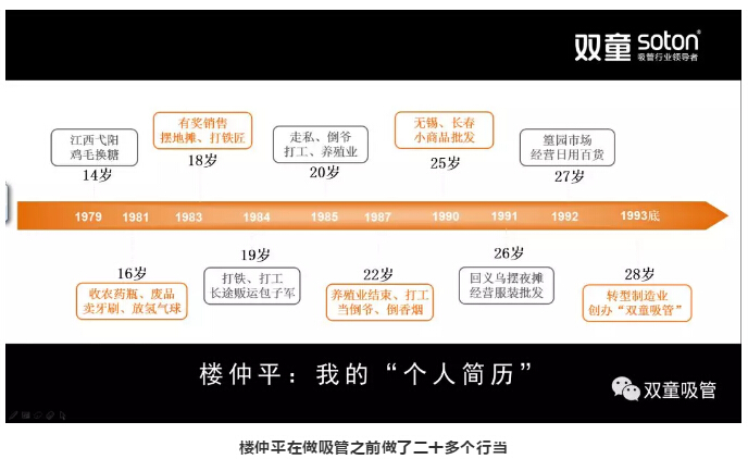 從1994年開(kāi)始,樓仲平專注于吸管事業(yè),克服重重困難成長(zhǎng)為中國(guó)最大的吸管制造企業(yè)。1998年亞洲金融危機(jī)時(shí),收購(gòu)10個(gè)同行業(yè)公司,使生產(chǎn)規(guī)模急劇擴(kuò)大。隨后,從國(guó)外大公司的外包訂單中擺脫出來(lái),從國(guó)際市場(chǎng)轉(zhuǎn)向以國(guó)內(nèi)市場(chǎng)為中心。在內(nèi)部管理改革上,因節(jié)能減排系統(tǒng)的投入使用,被授予浙江省《節(jié)能減排先進(jìn)模范企業(yè)獎(jiǎng)》。同時(shí),這種“雙童現(xiàn)象”受到社會(huì)和政府的廣泛關(guān)注。