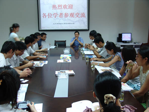2007年7月27日在義烏市人才交流中心余科長的帶領(lǐng)下,清華、人大博士研究生13人來我司參觀交流。公司張國俊副總對(duì)學(xué)者們的到來致歡迎詞,并對(duì)學(xué)者們的提問做了一一解答和交流。公司辦公室主任盧程航做了熱情接待,對(duì)公司情況做了詳細(xì)介紹,并陪同學(xué)者們?cè)趩T工寢室、車間等廠區(qū)進(jìn)行了參觀。