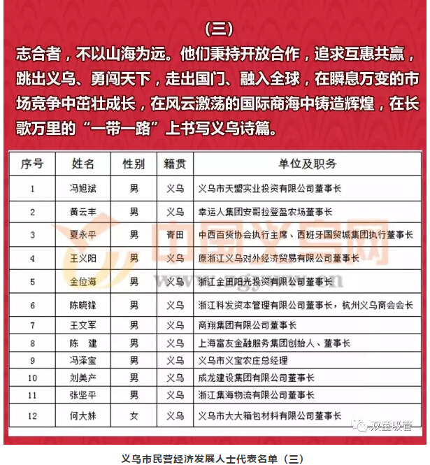 同時(shí),此次大會還對以下的義烏市民營經(jīng)濟(jì)發(fā)展代表人士進(jìn)行了頒獎表彰!