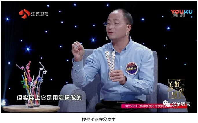 在“雙童”樓仲平上場后,主持人趙丹軍就被桌子上的各類吸管所吸引啦!樓仲平也向在場觀眾介紹了美觀環(huán)保的可降解吸管和極具特色的創(chuàng)新吸管。