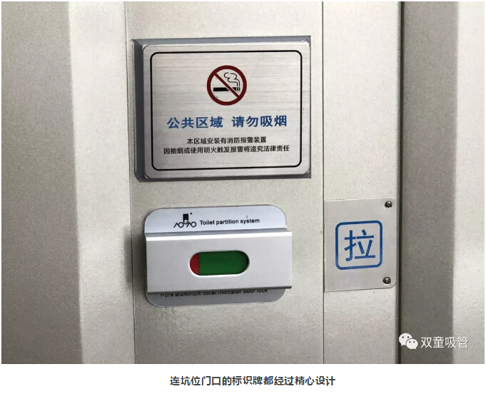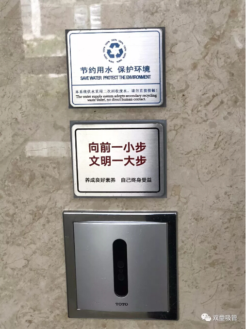 除此之外,“雙童”衛(wèi)生間還有許多文化引導(dǎo)的標(biāo)示牌。如:每扇門上都會有“公共區(qū)域,嚴(yán)禁吸煙”的標(biāo)識,每個(gè)蹲位后面都有“便后請沖水、素養(yǎng)高低往往體現(xiàn)在關(guān)上門自己獨(dú)處之時(shí)”等溫馨提示,從而引導(dǎo)員工提高自身素質(zhì),形成文化宣導(dǎo)氛圍!