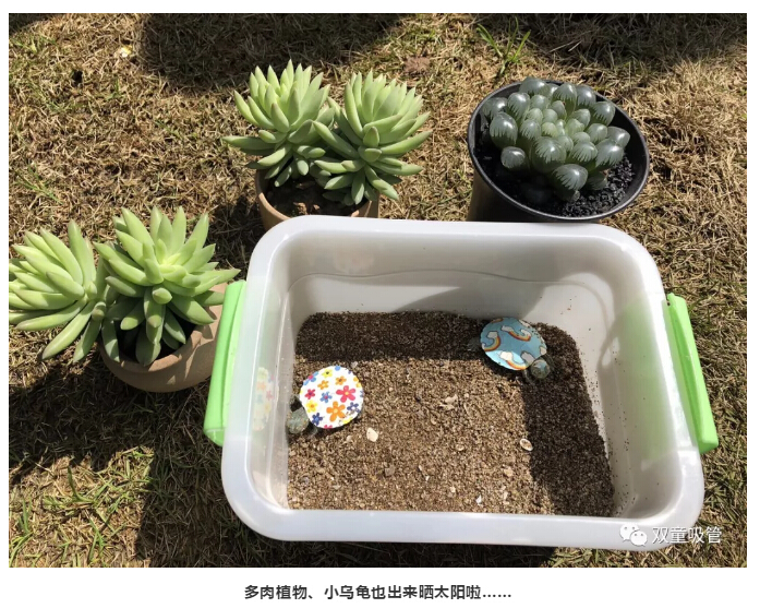“雙童”寶貝們也按耐不住了,來到草坪上嬉戲玩耍!不過,寶貝們可得小心哦,因為草坪上還曬著萌萌的多肉植物,可愛的小烏龜呢!