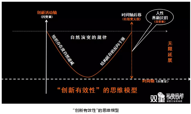 經(jīng)過前兩個“思維模型”的鋪墊,最后,樓仲平引導大家認知:昨天還是“創(chuàng)新”的東西,今天就未必還是“新”。所以,“創(chuàng)新”是有“時間軸”的,隨著“時間軸”不斷后移,原有的“創(chuàng)新”有效變成了無效,創(chuàng)新活動也就“無窮無盡”!