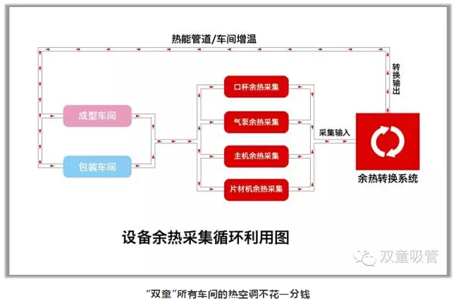 考慮到“雙童”生產(chǎn)設(shè)備產(chǎn)生大量余熱的狀況,生產(chǎn)車間安裝了余熱采集裝置,把所有生產(chǎn)設(shè)備的余熱和廢氣進(jìn)行采集并回收,采集的余熱經(jīng)過凈化處理后再通過管道供應(yīng)給所有車間進(jìn)行二次能源的利用(熱空調(diào)現(xiàn)在不用了,節(jié)能了大量的電費)!