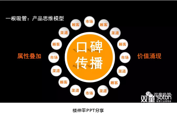 接著,樓仲平引導(dǎo)大家思考“產(chǎn)品 VS 商品”的關(guān)系,在這個(gè)模型中,產(chǎn)品本身(一根吸管)只是組成“商品”的基礎(chǔ)核心,是最基本的要素疊加之和,1+1=2。