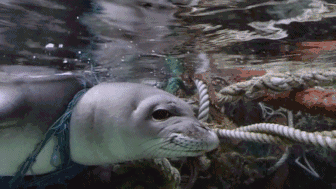 被廢棄物纏繞的海豹,脖子上出現(xiàn)一條深深的血痕