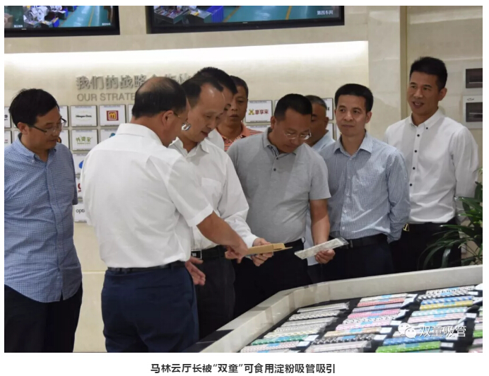 在參觀過(guò)程中,馬林云廳長(zhǎng)被“雙童”可食用淀粉吸管所吸引?!半p童”可食用淀粉吸管完全采用小麥、大米等天然農(nóng)作物淀粉制作而成,它不僅可以煮成面條,而且可以喂養(yǎng)牲畜。在使用丟棄后,短時(shí)間內(nèi)也能在任何生態(tài)環(huán)境下完全自然化解,非常環(huán)保!