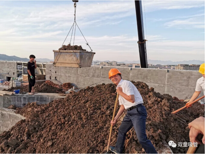 咦!“雙童”樓仲平怎么成為包工頭了?原來,樓仲平是“雙童”二期智能化工廠的總設計師,從2018年5月拿地開始,他就一直忙于新廠房設計規(guī)劃,新廠房中的節(jié)能降耗設施、6000平米的屋頂大花園、智能化互聯化的車間都需要設計師樓仲平指導施工,及時了解施工狀況。