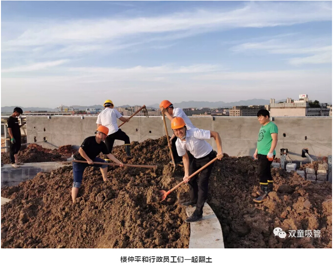 課程直播結束后,樓仲平再次來到新廠房工地進行巡查。在看到新廠房屋頂花園的土方堆的太高,容易產生安全隱患時,樓仲平馬上召集了部分行政人員應急,大家一起拿起鏟子開始鏟土,及時解決土方過高問題??磥?,樓大大真是快變成包工頭啦!