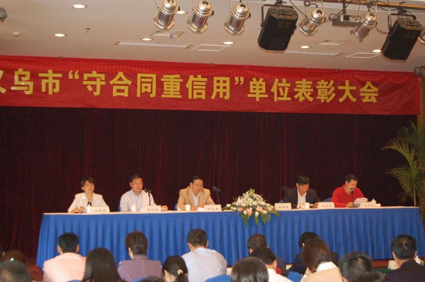 2007年10月18日上午辦公室主任盧程航代表公司參加義烏市“守合同重信用”單位表彰大會,義烏市政府副市長季金甫、義烏市工商局邱增法局長、工商局陸立權(quán)、洪金有、龔淑娟副局長等領(lǐng)導(dǎo)參加了會議。