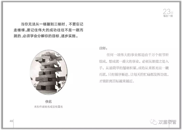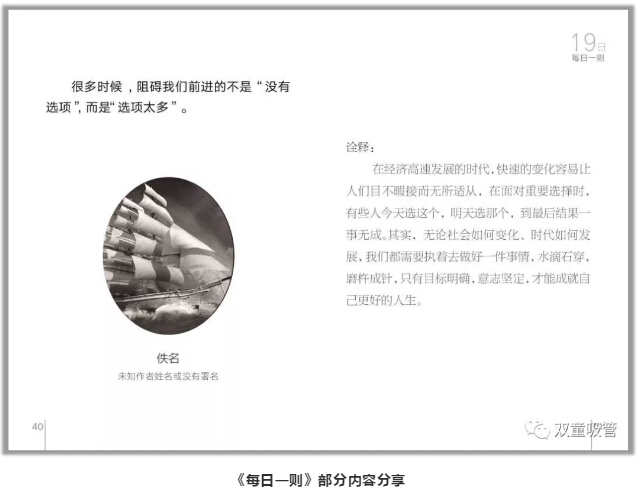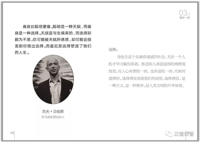 這本《每日一則》里,共收錄了31句名人經(jīng)典語(yǔ)錄,以月度為單位讓員工進(jìn)行重復(fù)誦讀,內(nèi)容包含了專注、創(chuàng)新、共贏、正氣等主題。這可是員工們從幾千條好句里挑出來(lái),并且自己解析的呢!