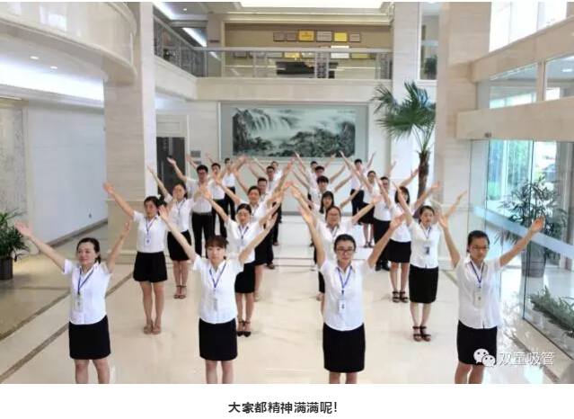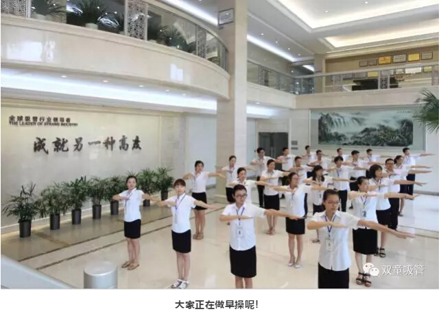 除了精神上要得到提升之外,我們的身體素質(zhì)也非常重要!每天,在晨讀環(huán)節(jié)結(jié)束之后,我們都會(huì)進(jìn)行早操活動(dòng)。俗話說(shuō),“一年之際在于春,一天之際在于晨”。在“雙童”行政大廳,員工們列隊(duì)整齊,精神飽滿,氣宇軒昂,伴著豪邁的音樂(lè),用整齊劃一的動(dòng)作做起早操,形成了一道靚麗的風(fēng)景線。