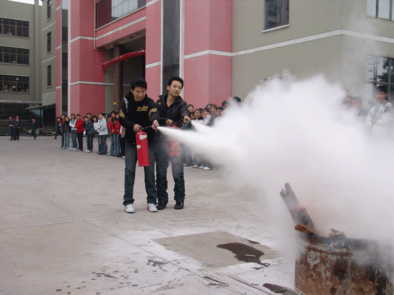 上圖為員工使用干粉滅火器進(jìn)行滅火比賽現(xiàn)場(chǎng)