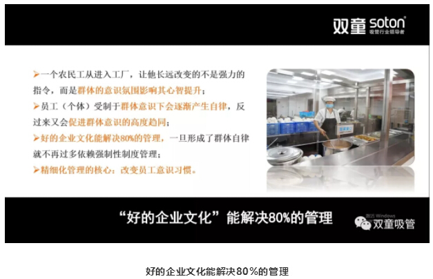 由此,我們認(rèn)知到:質(zhì)量的改善僅有硬件和制度是不夠的,更需要不斷提升每一位員工的素養(yǎng),形成高度統(tǒng)一的群體意識 。自此,“雙童”質(zhì)量文化開始逐步完善,通過硬件環(huán)境和文化氛圍潛移默化地影響員工,用精細(xì)化管理的方式改變員工的意識和習(xí)慣。