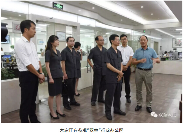 參觀完中國(guó)吸管博物館之后,義烏法院黨組書(shū)記、代院長(zhǎng)胡公益一行人在樓仲平的帶領(lǐng)下參觀“雙童”公開(kāi)、透明的行政辦公區(qū)。