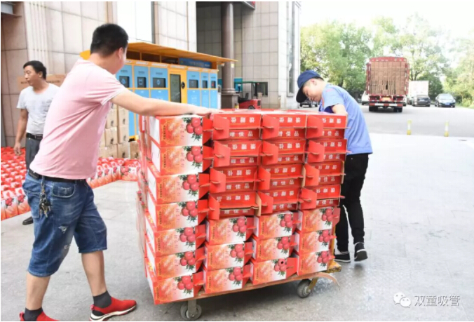 厲害了“雙童”人!有些部門的同事們直接拉著車把本部門的獎(jiǎng)品全領(lǐng)啦!每個(gè)員工一箱石榴、一盒月餅。
