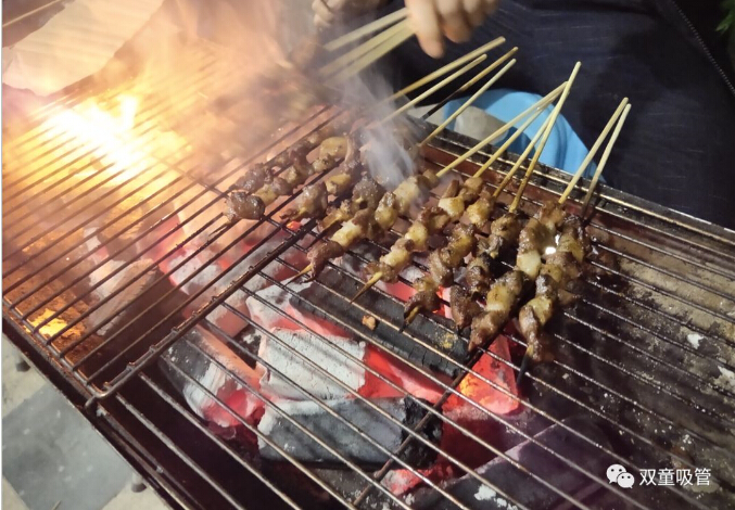 大家圍坐在烤爐前爭當“燒烤小販”,為壽星們進行服務(wù)。大伙手上的肉串還沒吃完,“燒烤小販”們已經(jīng)笑瞇瞇地把新烤好的肉串奉上了,吃都來不及,這是什么節(jié)奏!