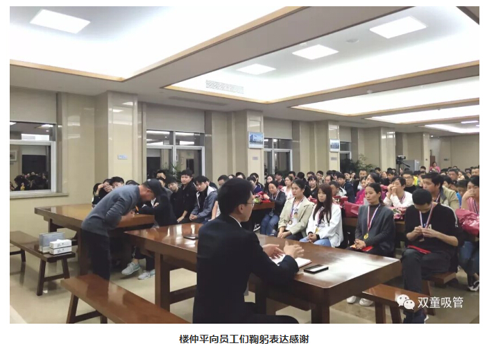 樓仲平三鞠躬感謝基層員工 表彰大會(huì)開始后,“雙童”樓仲平再次為員工站臺(tái),進(jìn)行肺腑發(fā)言,并連續(xù)三鞠躬感謝基層員工: 一鞠躬:感謝口杯車間兩個(gè)班組的努力奮斗 “第一點(diǎn),我每個(gè)月必然會(huì)參加員工表彰大會(huì),除了出差趕不回來的突發(fā)狀況,一定會(huì)每個(gè)月給大家站臺(tái)。另外,我要求每月發(fā)放不少于二十萬優(yōu)秀員工獎(jiǎng)金作為管理指標(biāo),我不參與任何評(píng)價(jià)和監(jiān)督,我相信時(shí)間長了團(tuán)隊(duì)總得去琢磨這筆錢怎么給才公平合理,讓更多人能夠覺得自己受到尊重,我覺得這是改革的價(jià)值所在。
