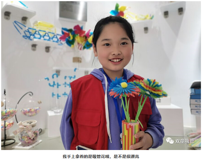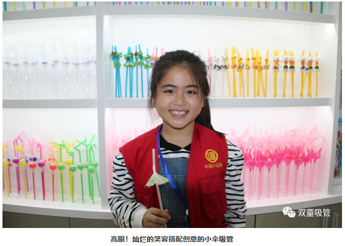 一走進(jìn)“雙童”產(chǎn)品展區(qū)時(shí),小記者們就在不停的尋找“雙童”可食用淀粉吸管。究竟這款“可以吃的吸管”藏在哪呢?