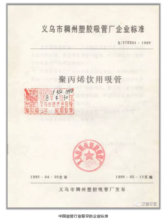 建設(shè)工廠缺少資金,樓仲平不僅把全部積蓄投進(jìn)去,還關(guān)掉了義烏市場(chǎng)一直在盈利的攤位;沒(méi)有行業(yè)標(biāo)準(zhǔn),只有小學(xué)文化的他,自己埋頭鉆研制定指標(biāo)、量化參數(shù)。1997年10月,由“雙童”起草的Q/YCSX01《聚丙烯飲用吸管》企業(yè)標(biāo)準(zhǔn)審核通過(guò),成為吸管行業(yè)最早的產(chǎn)品標(biāo)準(zhǔn)。