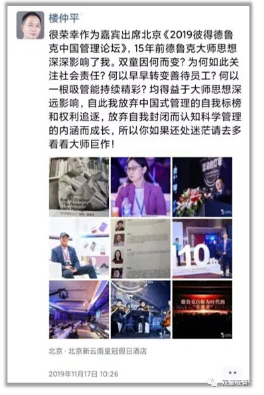 11月17日,“雙童”樓仲平作為受邀嘉賓出席了彼得·德魯克中國管理論壇。在論壇結(jié)束后,樓仲平在朋友圈發(fā)出了這樣的感嘆: