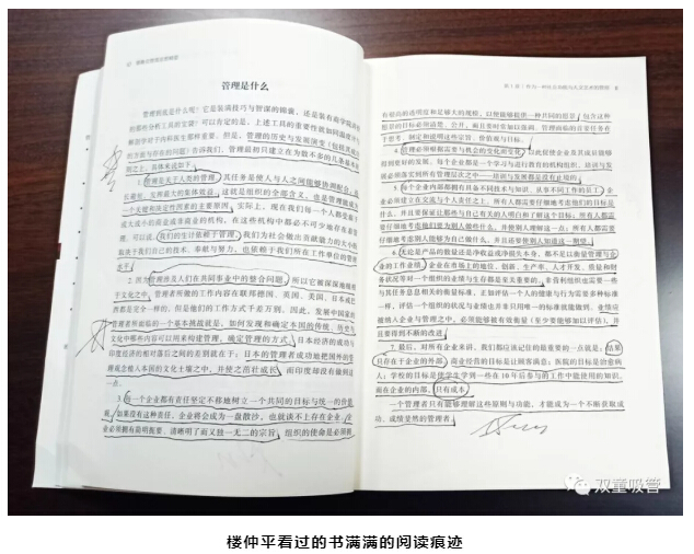 其實(shí),樓仲平早在很多年前,就已經(jīng)開始閱讀現(xiàn)代管理學(xué)之父德魯克的書籍,他的書架上擺滿了德魯克的管理學(xué)著作。這些書籍經(jīng)過他反復(fù)閱讀,已經(jīng)畫滿了圈圈點(diǎn)點(diǎn)的筆記。