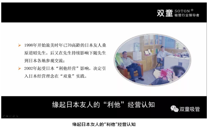 1998年,“雙童”樓仲平結(jié)識(shí)了一位旅美日本友人桑原道昭先生。桑原道昭先生在美國(guó)待了45年,會(huì)一點(diǎn)漢語(yǔ)。他會(huì)和樓仲平交流做生意的看法,并用日本人的視角和思想解讀節(jié)能環(huán)保、節(jié)約土地、員工關(guān)懷等方面的話題。