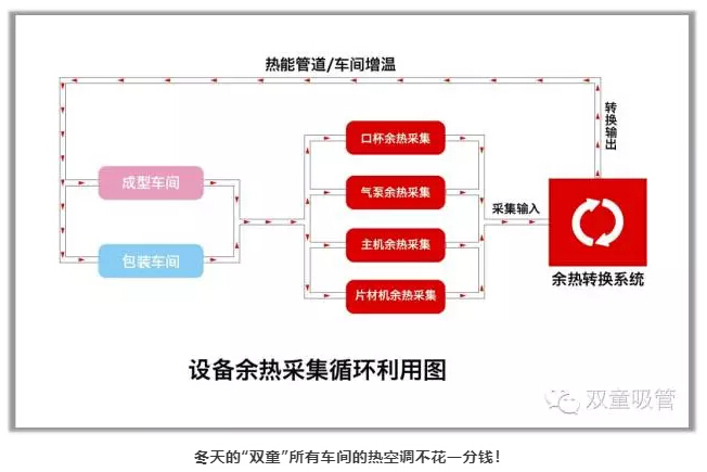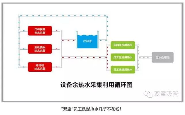 “雙童”對(duì)所有經(jīng)過模具的50度溫水進(jìn)行收集,處理之后供應(yīng)到所有寢室衛(wèi)生間給員工洗澡洗衣生活之用。同時(shí),“雙童”對(duì)所有生產(chǎn)設(shè)備的余熱和廢氣進(jìn)行采集并回收,再通過空調(diào)管道輸送到需要加溫的各個(gè)車間和工段。通過上述方式,“雙童”光是在余熱水采集和設(shè)備余熱采集方面,每年就節(jié)省了150多萬(wàn)元,消滅了企業(yè)產(chǎn)生的污染和排放!