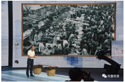 在節(jié)目現(xiàn)場,“雙童”樓仲平也帶來了許多精彩的照片。其中,開場照片便是義烏這座城市的對比照片。通過挑貨郎與義烏小商品城開展全球電商的照片對比,樓仲平講述了義烏如何從貧瘠落后的小縣城發(fā)展為全球最大的小商品集散中心的故事……